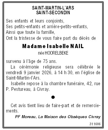 Décédée à Civray (86400, France) le dimanche 4 janvier 2026 à l'âge de 75 ans