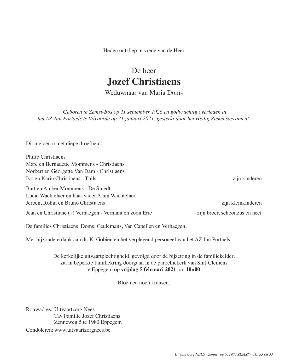 Died in Vilvoorde (1800) on 31 January 2021 at the age of 94 years