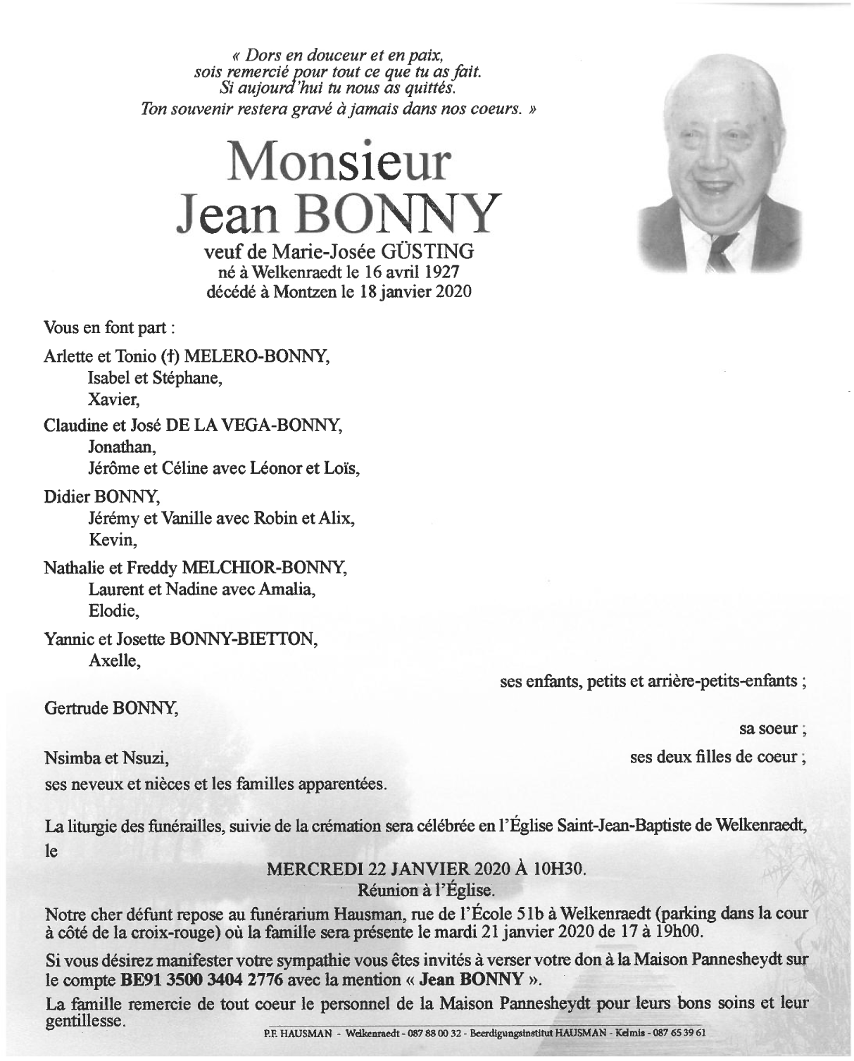 Décédé à Montzen (4850) le samedi 18 janvier 2020 à l'âge de 92 ans