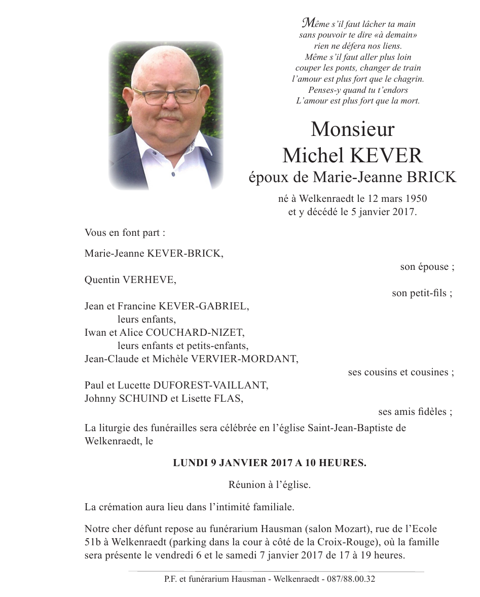 Décédé à Welkenraedt (4840) le jeudi 5 janvier 2017 à l'âge de 66 ans
