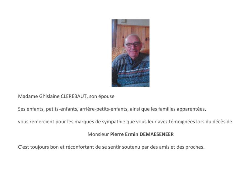 |  Domiciliado en Saint-Symphorien (7030) Nacido en Masnuy-Saint-Pierre (7050) el martes, 4 de septiembre de 1934 Fallecido en Saint-Symphorien (7030) el domingo, 8 de enero de 2017 a la edad de 82 años Esposo de Madame Ghislaine DEMAESENEER née CLEREBAUT