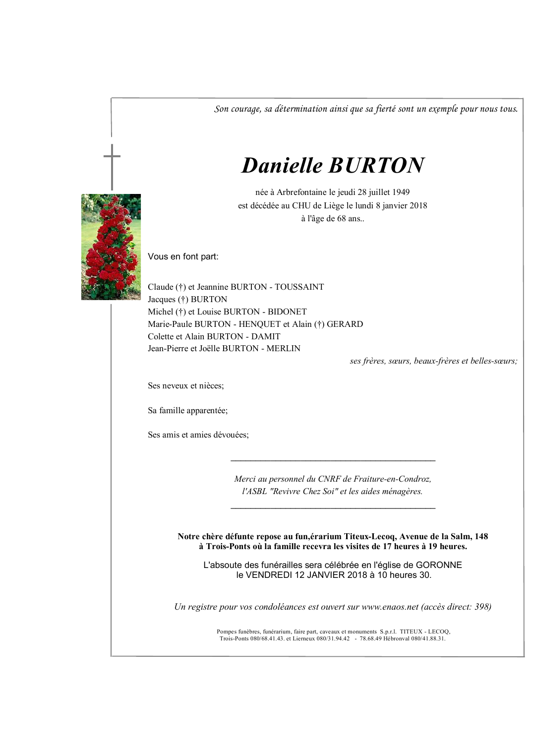 Décédée à Liège (4000) le lundi 8 janvier 2018 à l'âge de 68 ans