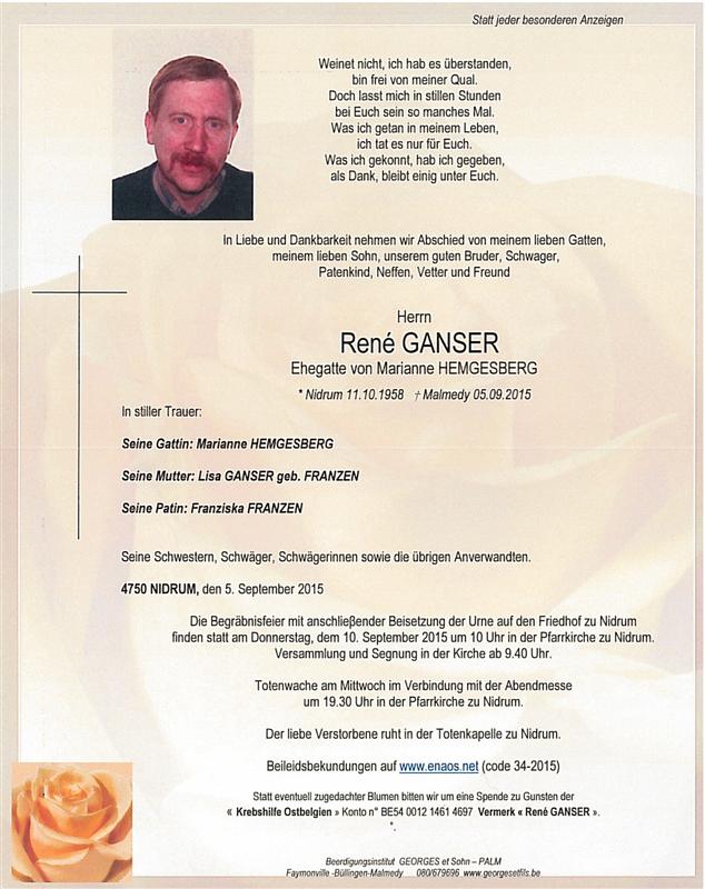Fallecido en Malmedy (4960) el sábado, 5 de septiembre de 2015 a la edad de 56 años