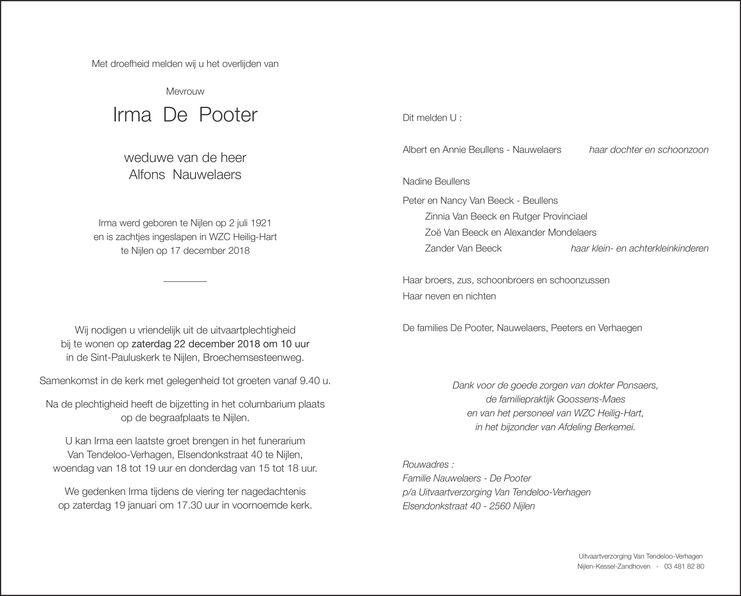 Fallecida en Nijlen (2560) el lunes, 17 de diciembre de 2018 a la edad de 97 años