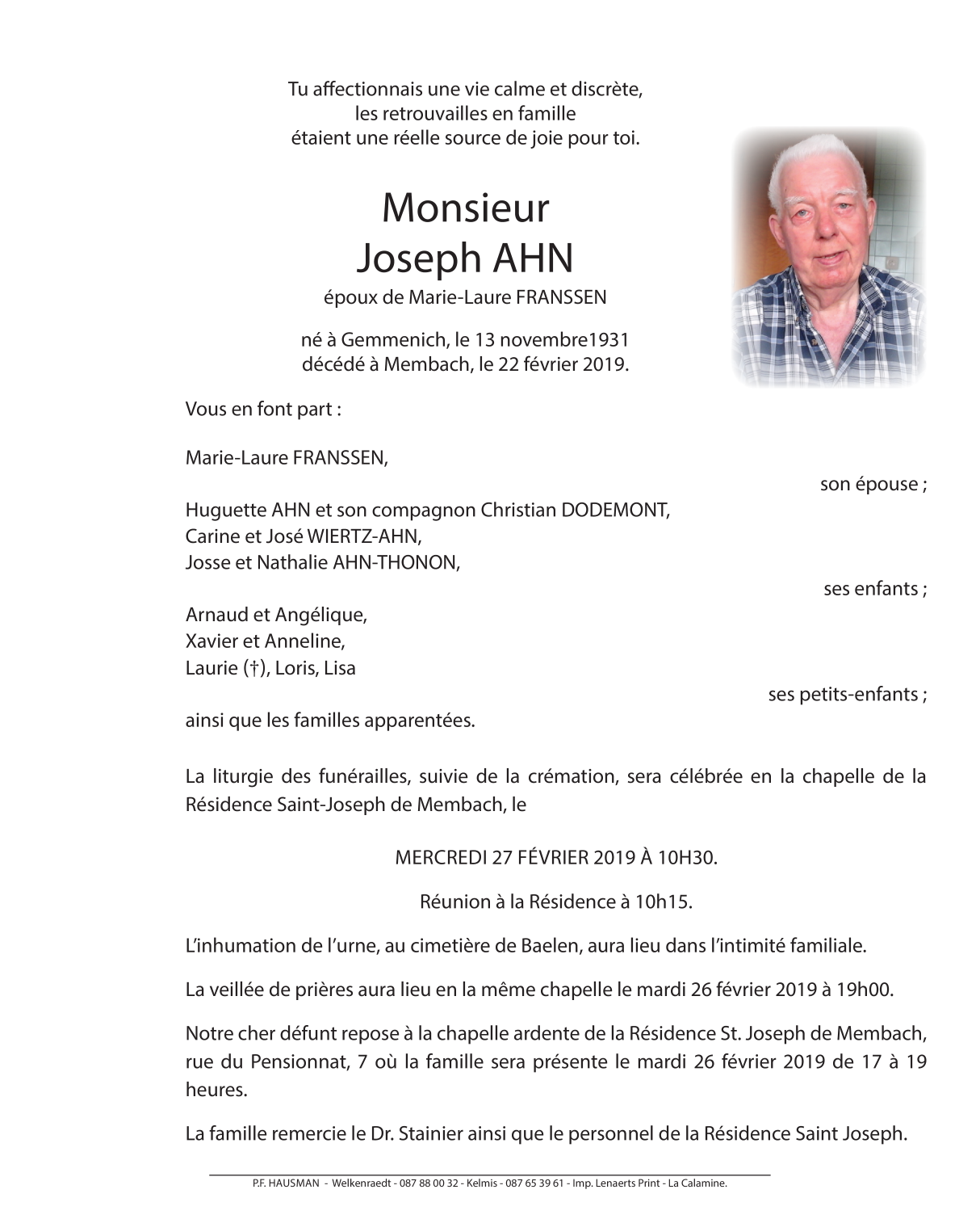 Died in Membach (4837) on 22 February 2019 at the age of 87 years