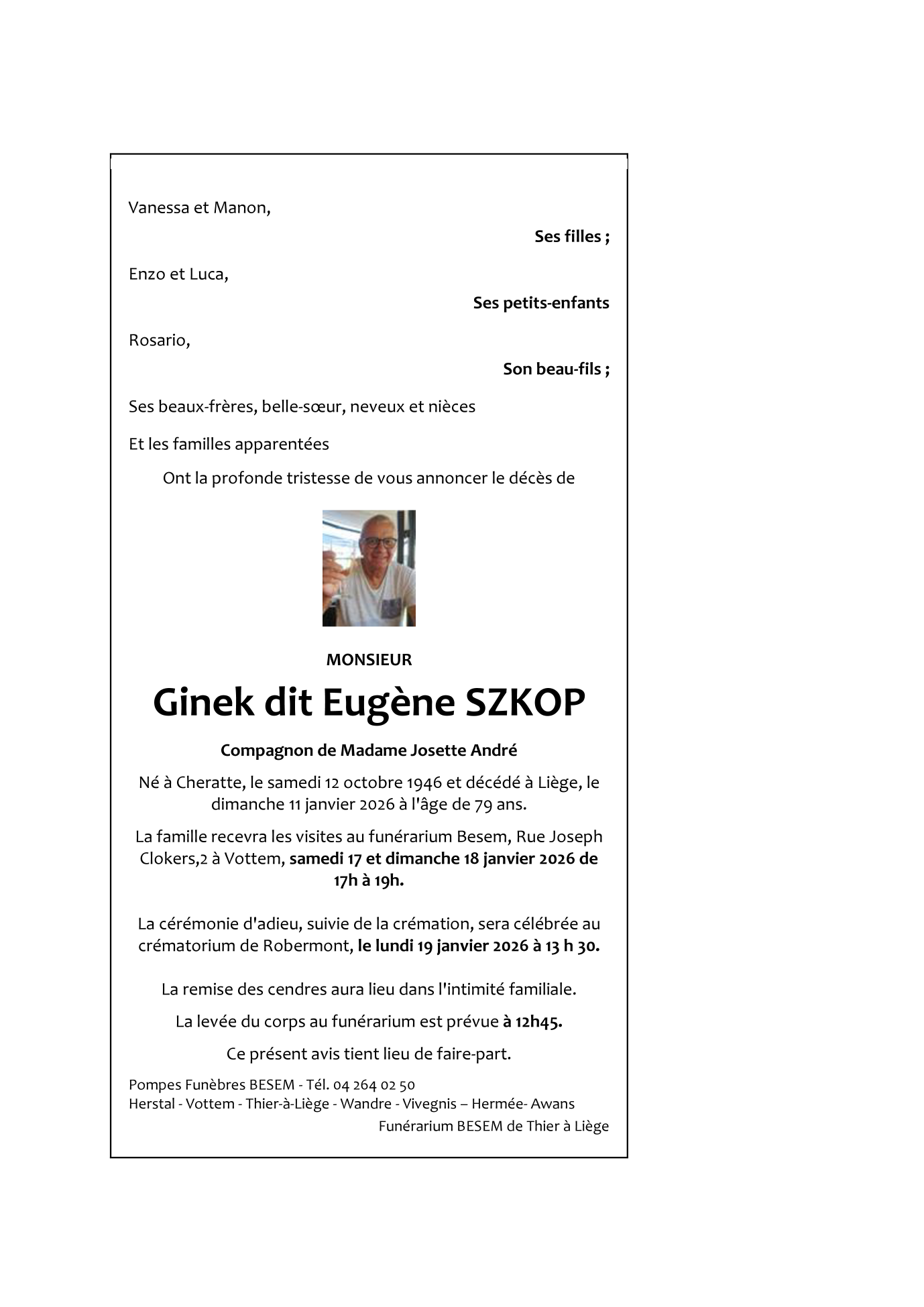Fallecido en Liège (4000) el domingo, 11 de enero de 2026 a la edad de 79 años