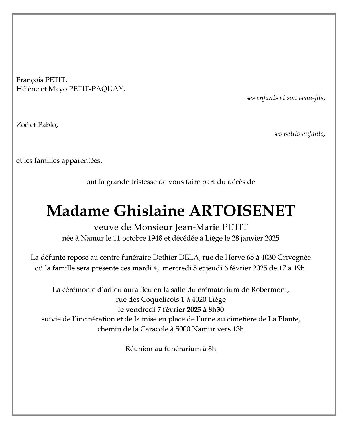 Weduwe van Monsieur Jean-Marie PETIT