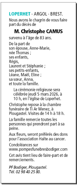 Décédé à Brest (29200, France) le samedi 28 février 2026 à l'âge de 83 ans