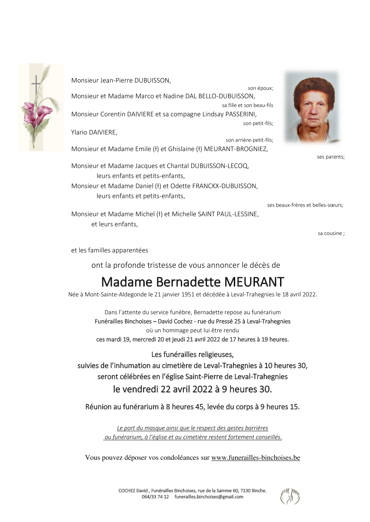 Fallecida en Leval-Trahegnies (7134) el lunes, 18 de abril de 2022 a la edad de 71 años