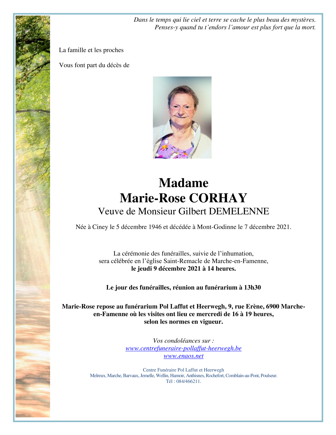 Décédée à Mont-Godinne (5530) le mardi 7 décembre 2021 à l'âge de 75 ans