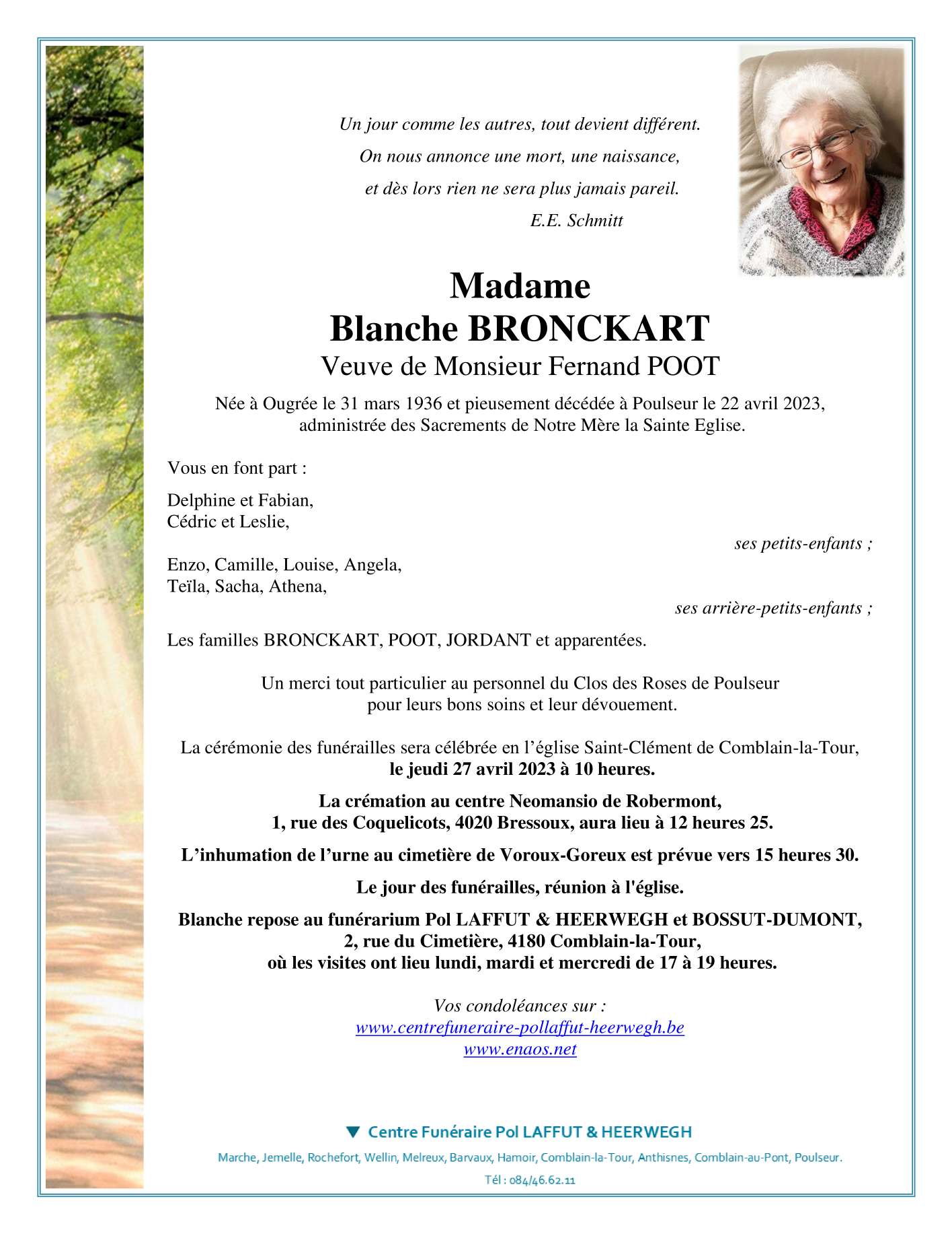 Décédée à Poulseur (4171) le samedi 22 avril 2023 à l'âge de 87 ans