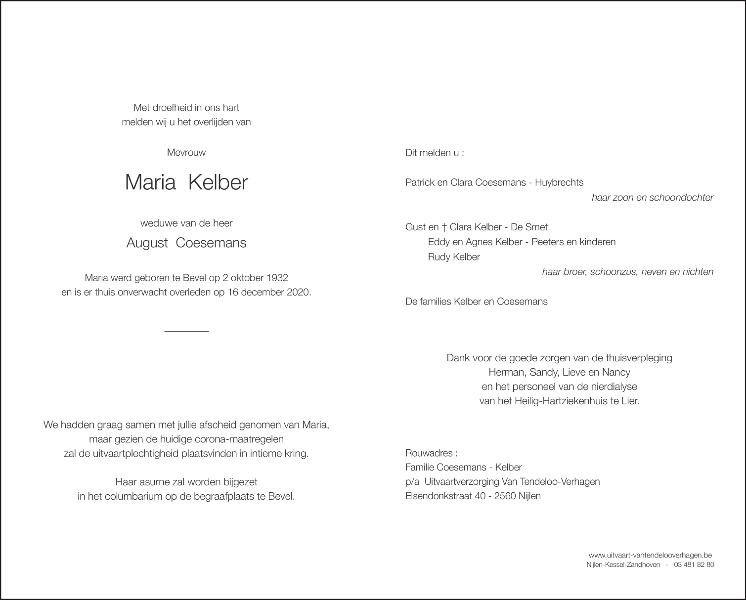 Overleden te Bevel (2560) op woensdag 16 december 2020 op 88-jarige leeftijd