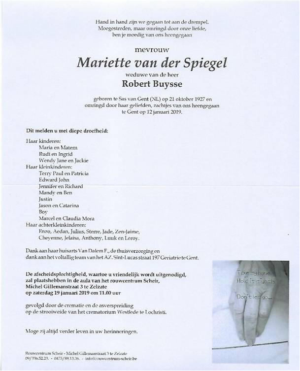 Died in Gent (9000) on 12 January 2019 at the age of 91 years