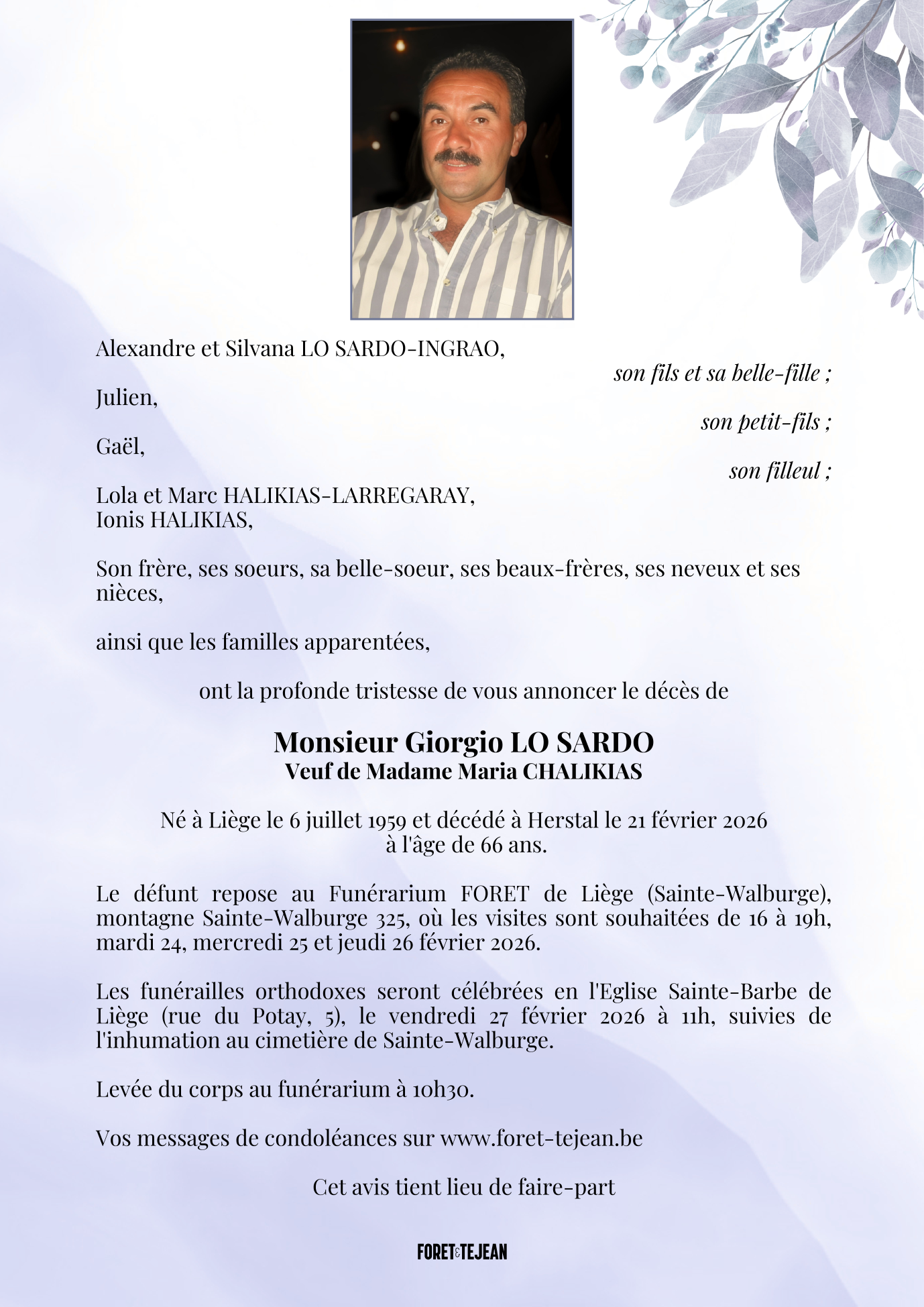 Décédé à Herstal (4040) le samedi 21 février 2026 à l'âge de 66 ans