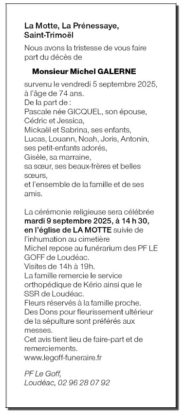 Décédé à Loudéac (22600, France) le vendredi 5 septembre 2025 à l'âge de 74 ans
