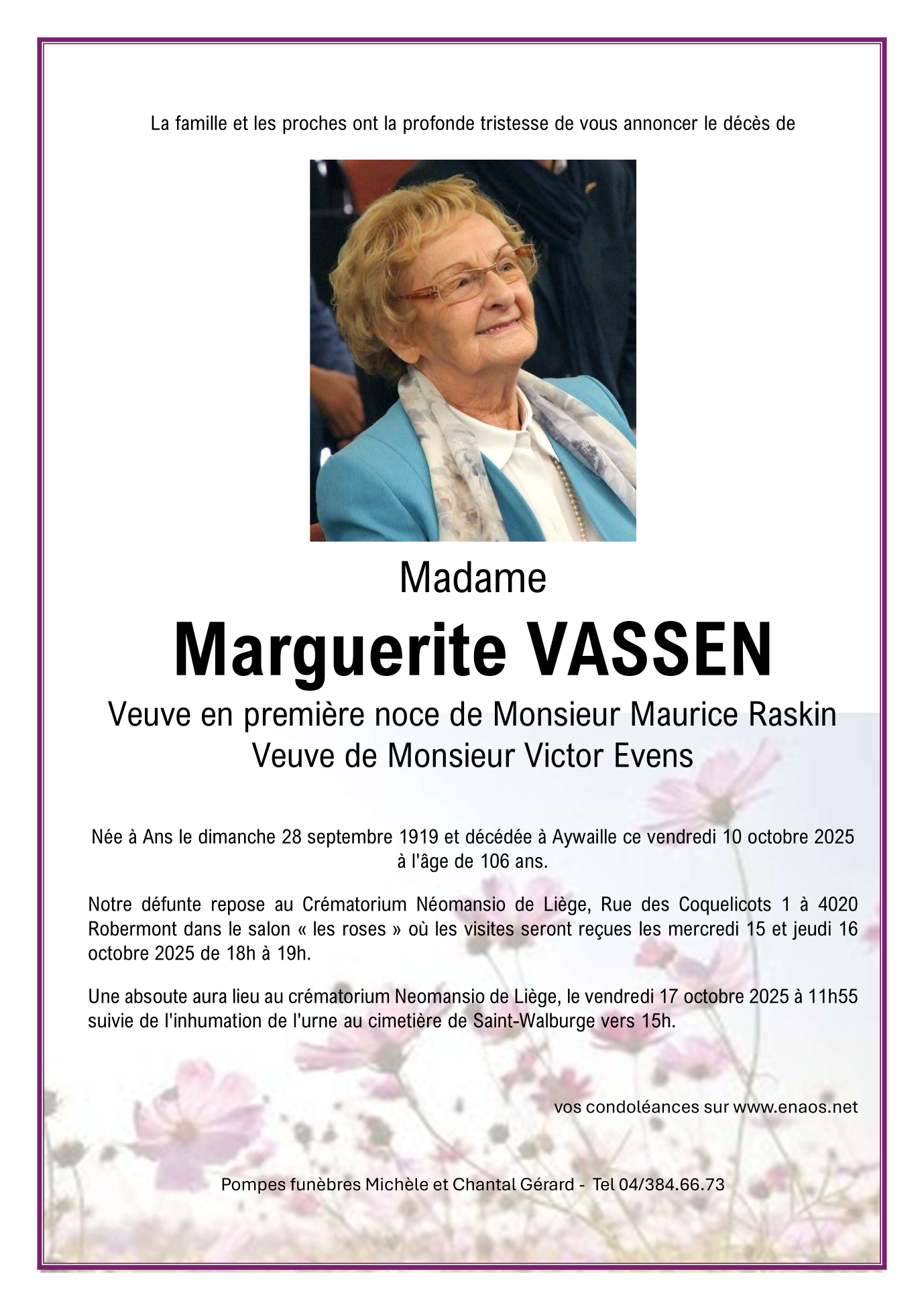 Décédée à Aywaille (4920) le vendredi 10 octobre 2025 à l'âge de 106 ans