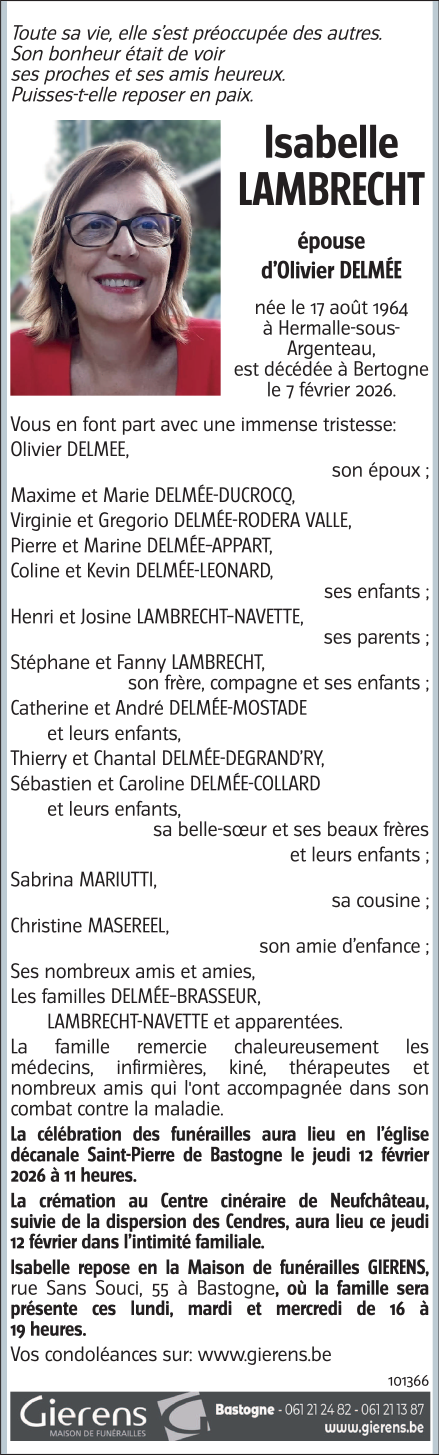 Décédée à Bertogne (6687) le samedi 7 février 2026 à l'âge de 61 ans