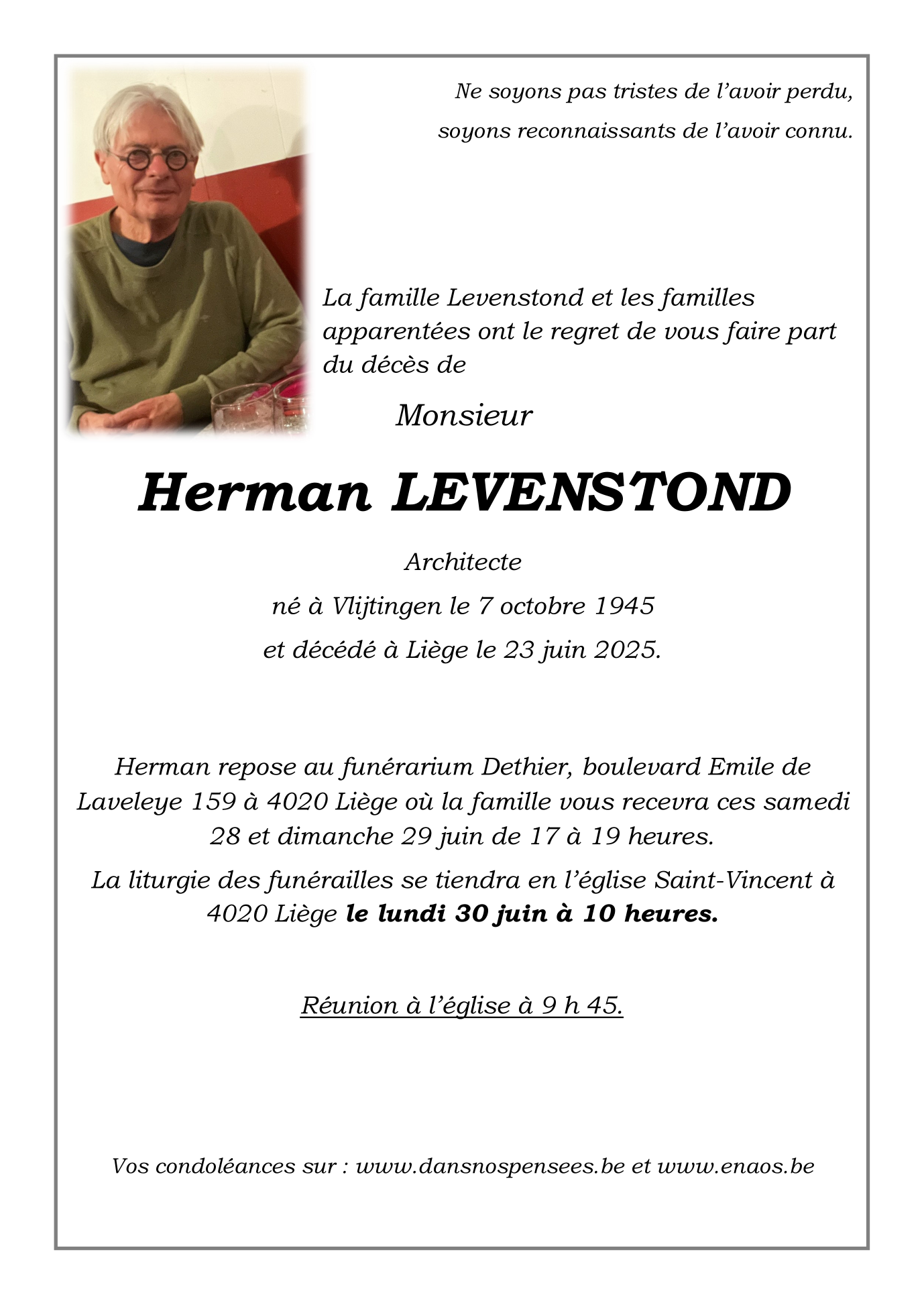 Died in Liège (4000) on 23 June 2025 at the age of 79 years