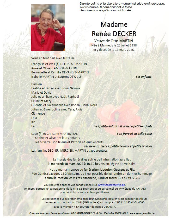 Décédée à Malmedy (4960) le vendredi 13 mars 2026 à l'âge de 87 ans