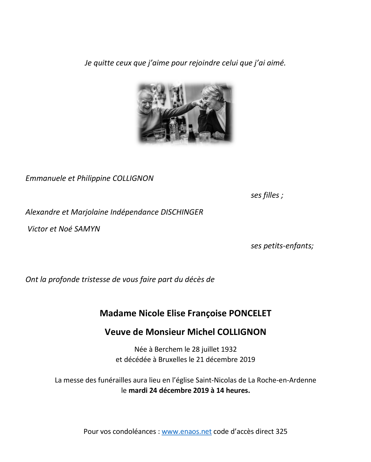 Décédée à Bruxelles (1000) le samedi 21 décembre 2019 à l'âge de 87 ans