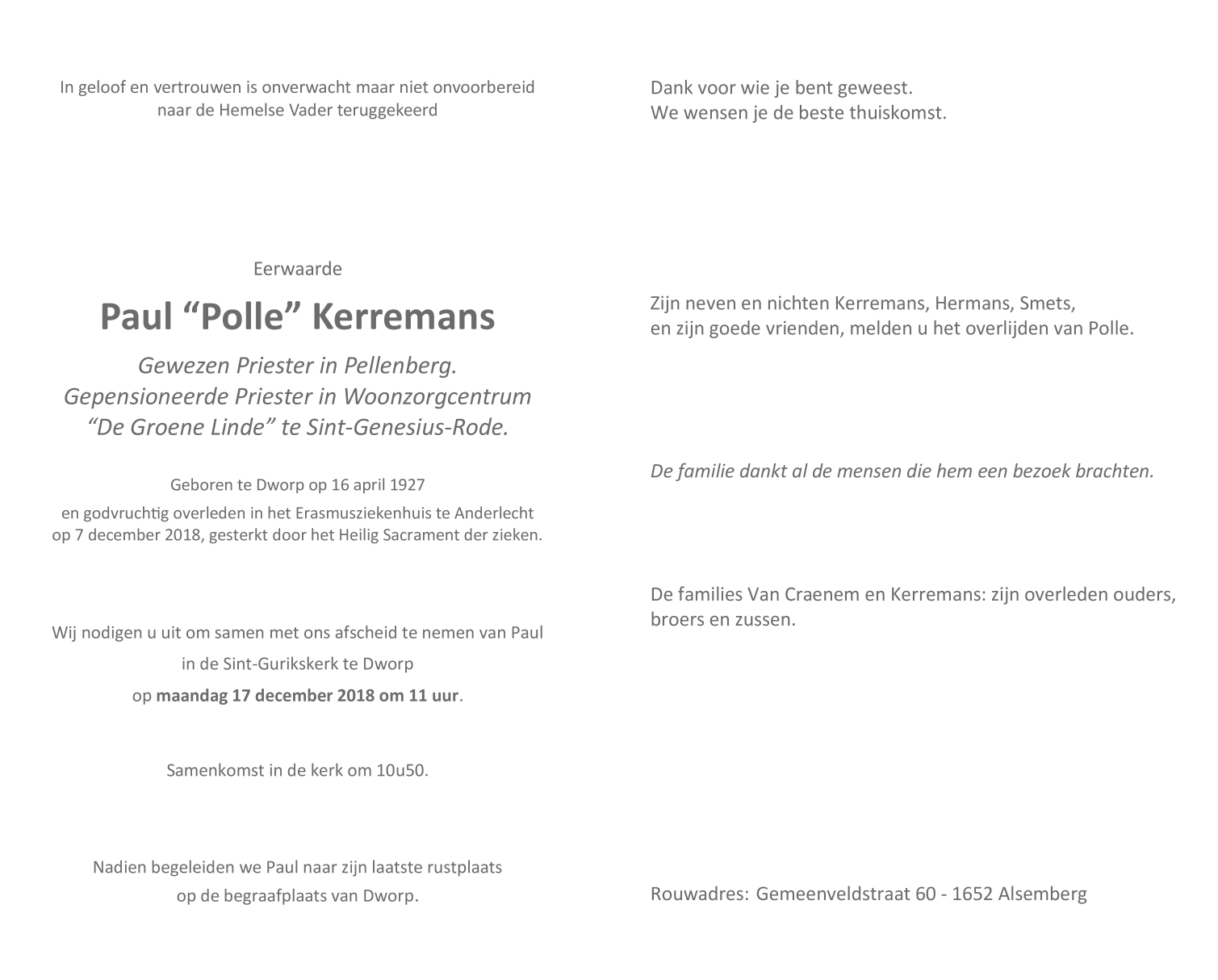 Décédé à Anderlecht (1070) le vendredi 7 décembre 2018 à l'âge de 91 ans