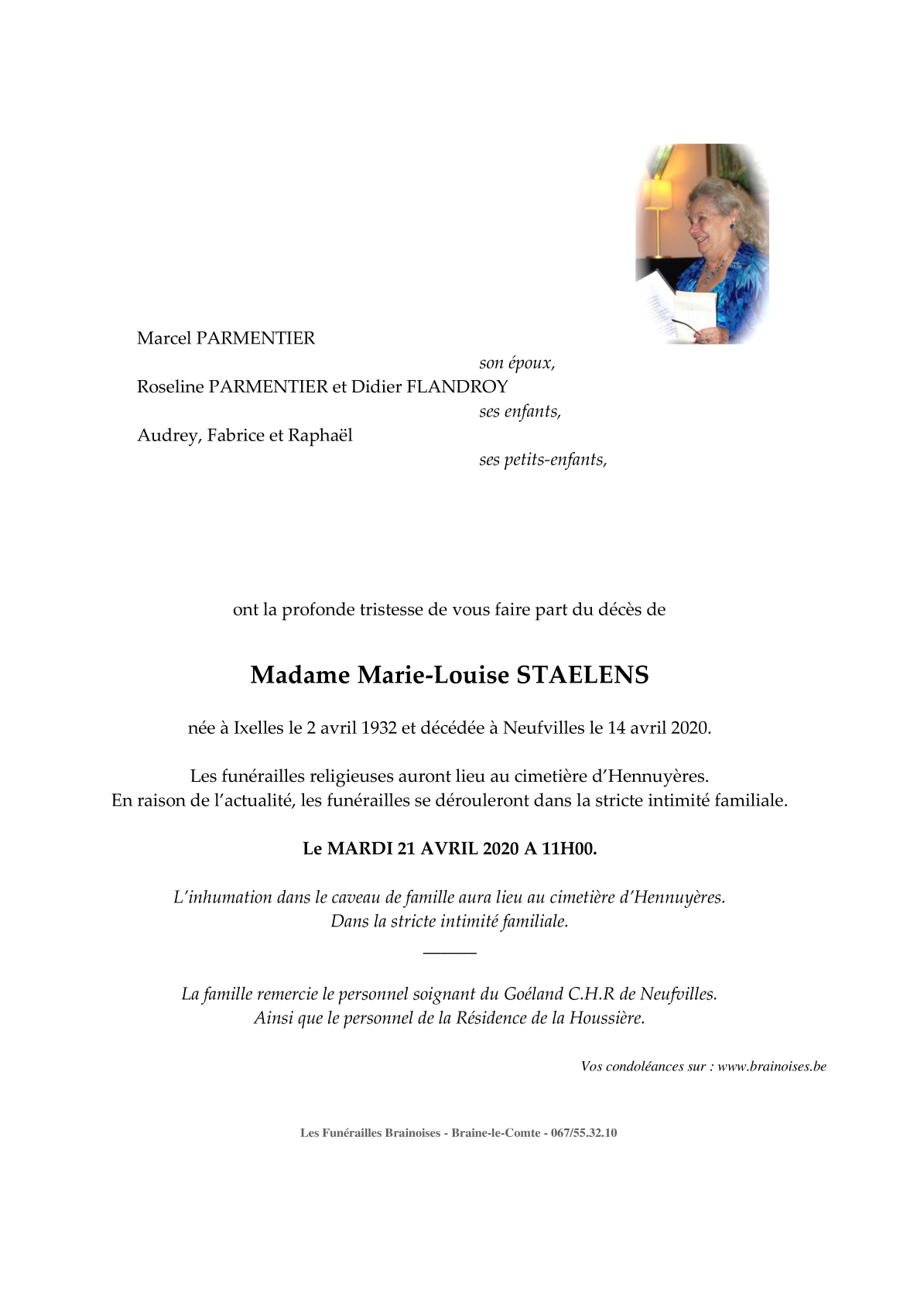 Décédée à Neufvilles (7063) le mardi 14 avril 2020 à l'âge de 88 ans