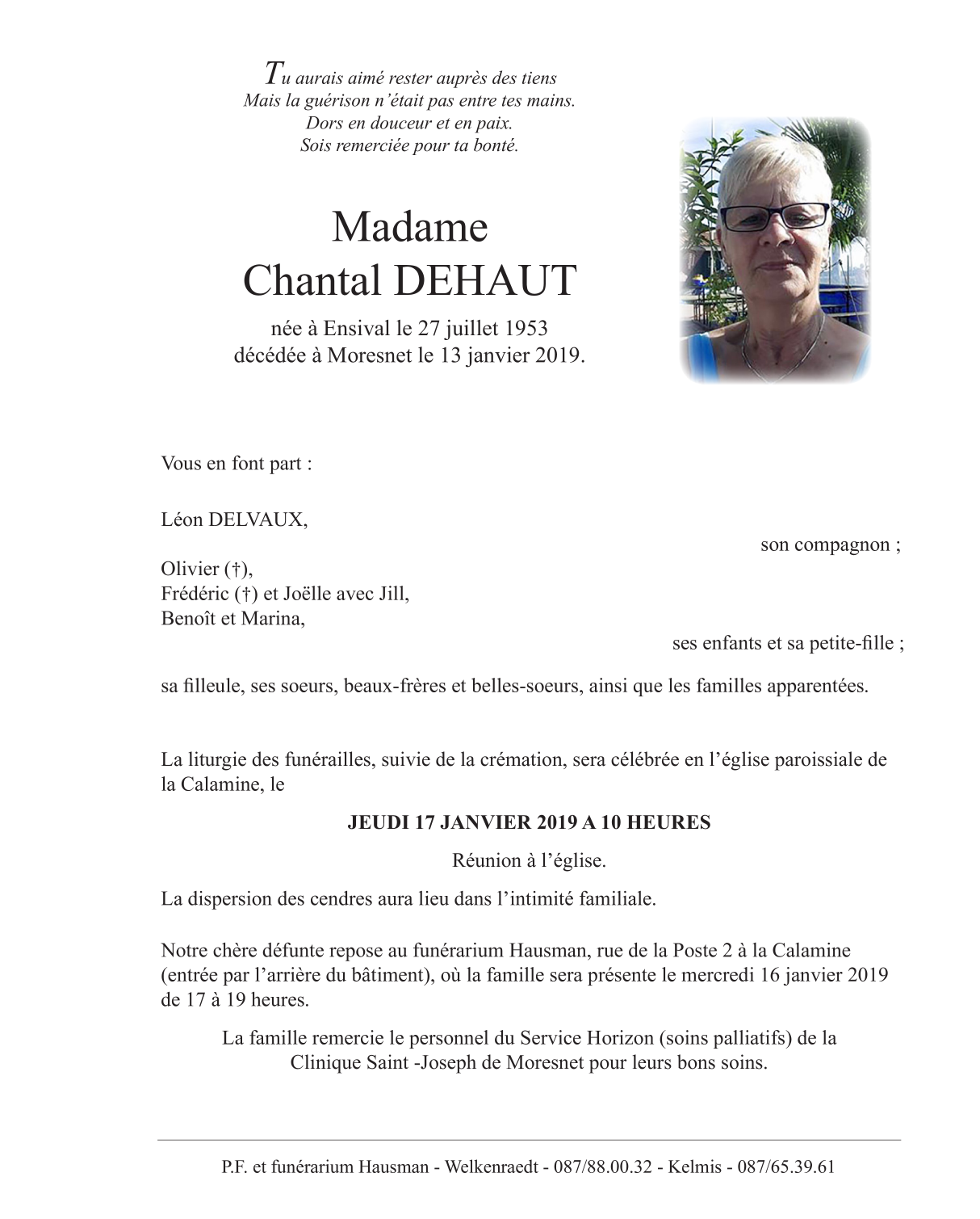 Overleden te Moresnet (4850) op zondag 13 januari 2019 op 65-jarige leeftijd