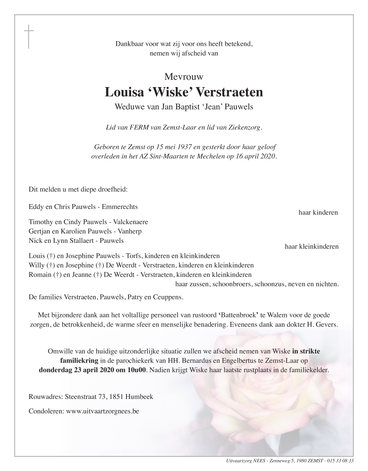 Décédée à Mechelen (2800) le jeudi 16 avril 2020 à l'âge de 82 ans