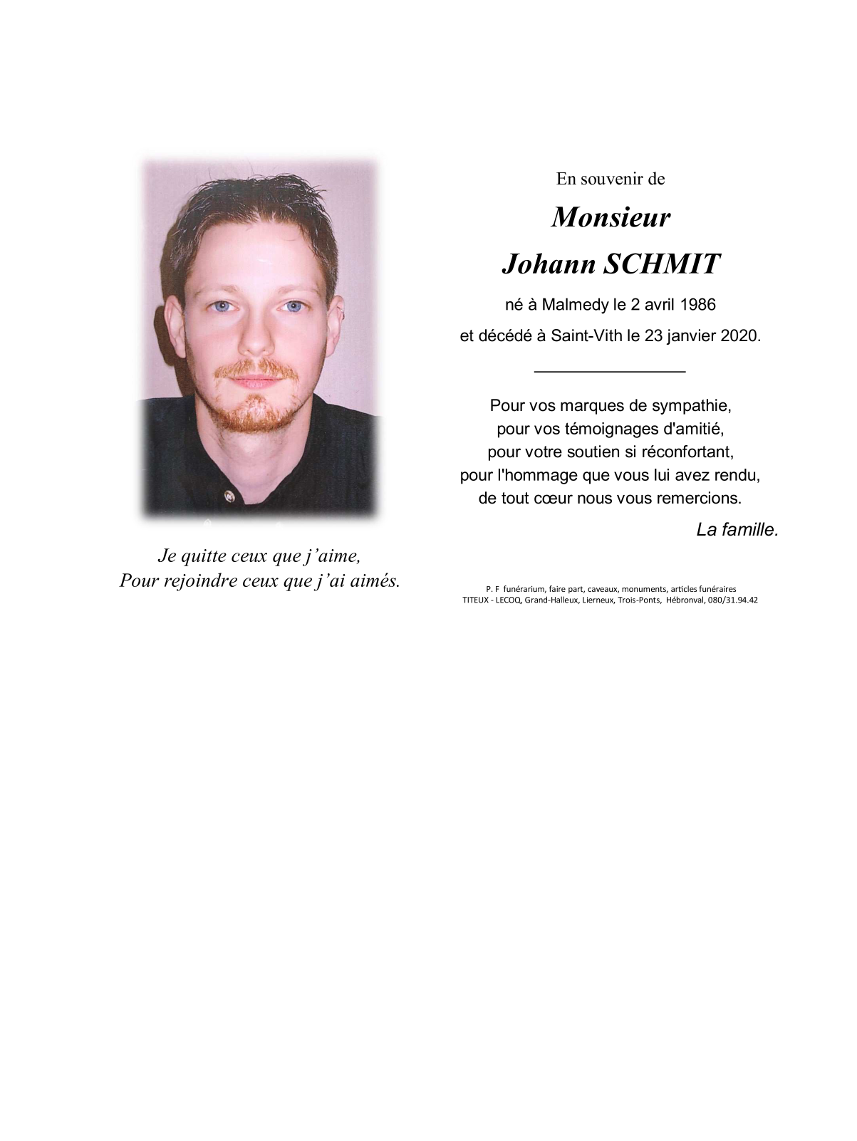 Fallecido en Saint-Vith (4780) el jueves, 23 de enero de 2020 a la edad de 33 años