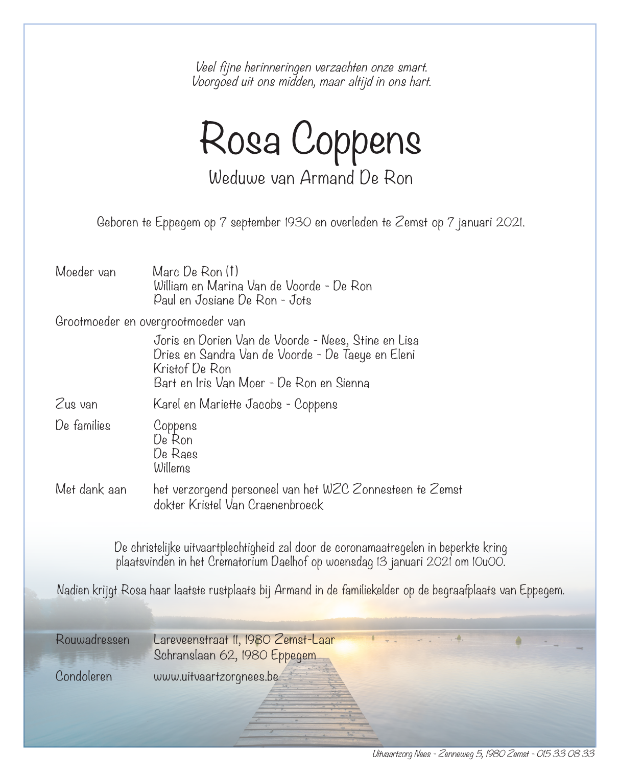 Décédée à Zemst (1980) le jeudi 7 janvier 2021 à l'âge de 90 ans