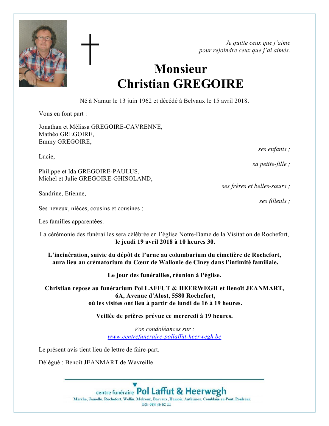 Décédé à Belvaux (5580) le dimanche 15 avril 2018 à l'âge de 55 ans