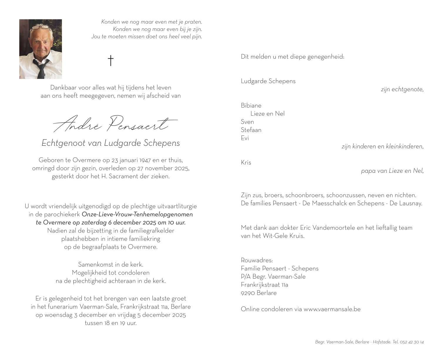 Décédé à Overmere (9290) le jeudi 27 novembre 2025 à l'âge de 78 ans