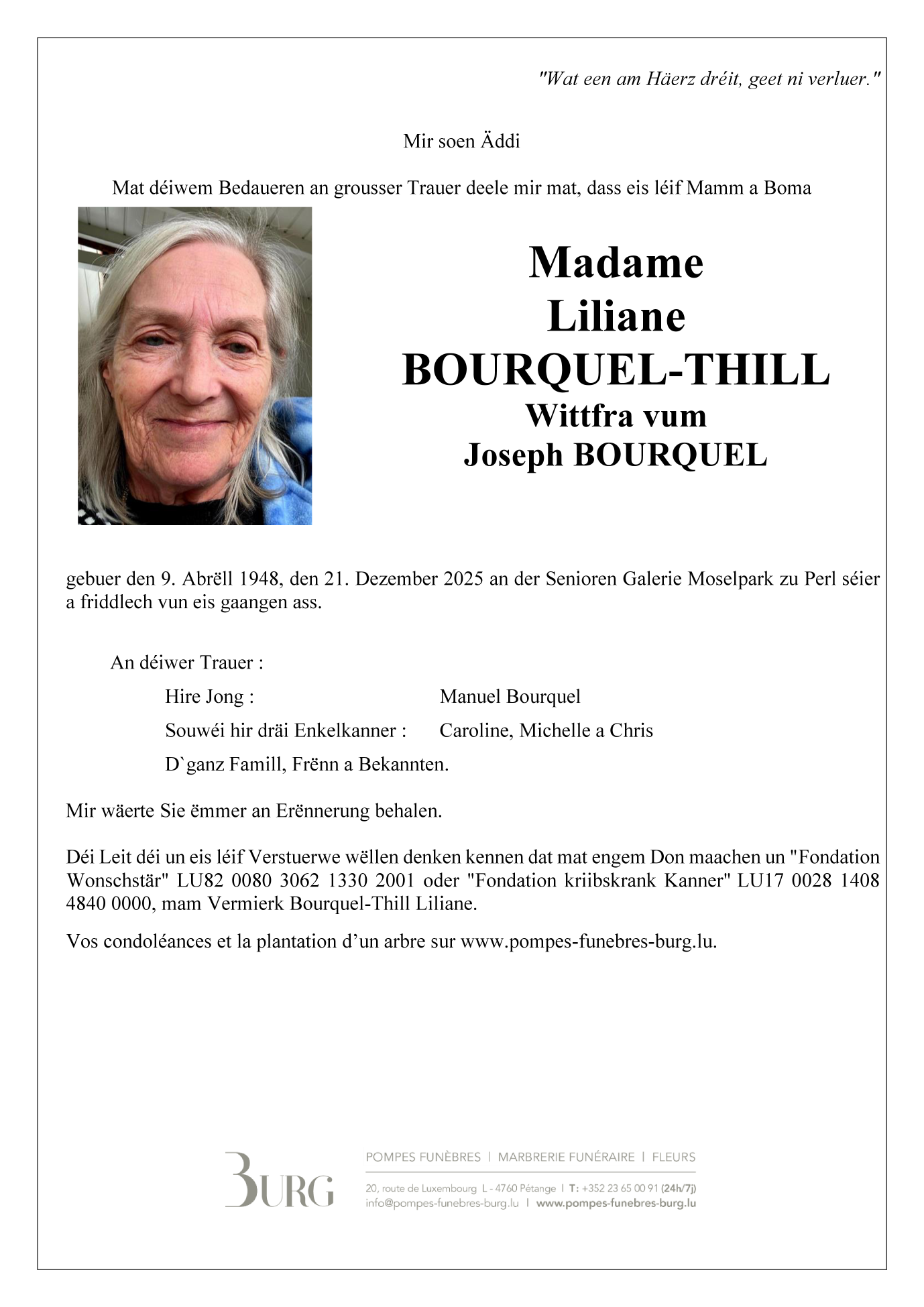 Née à Petange/Luxembourg  (4760, Luxembourg) le vendredi 9 avril 1948