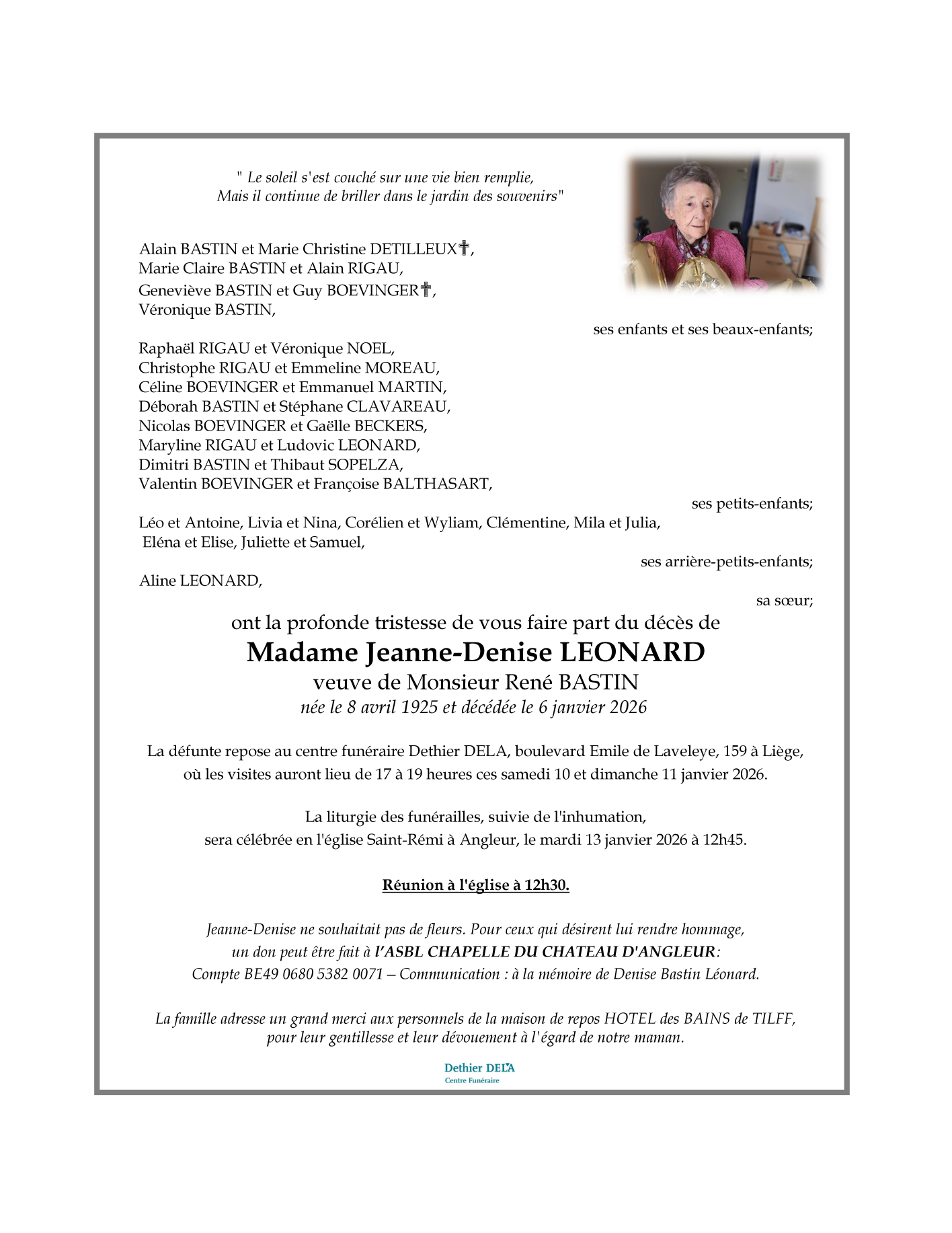 Décédée à Tilff (4130) le mardi 6 janvier 2026 à l'âge de 100 ans