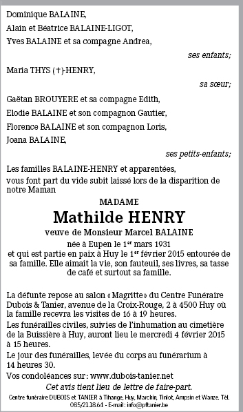 Overleden te Huy (4500) op zondag 1 februari 2015 op 83-jarige leeftijd