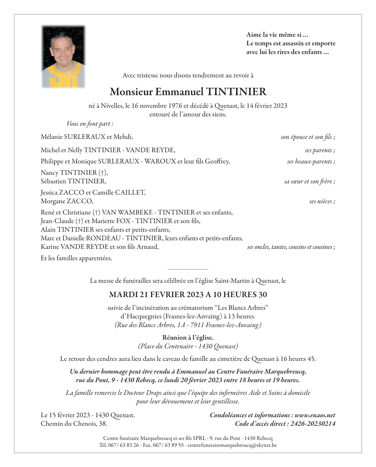Overleden te Quenast (1430) op dinsdag 14 februari 2023 op 46-jarige leeftijd