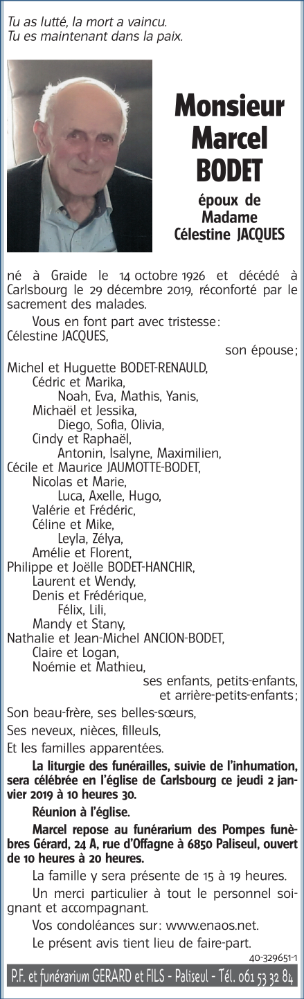 Died in Carlsbourg (6850) on 29 December 2019 at the age of 93 years