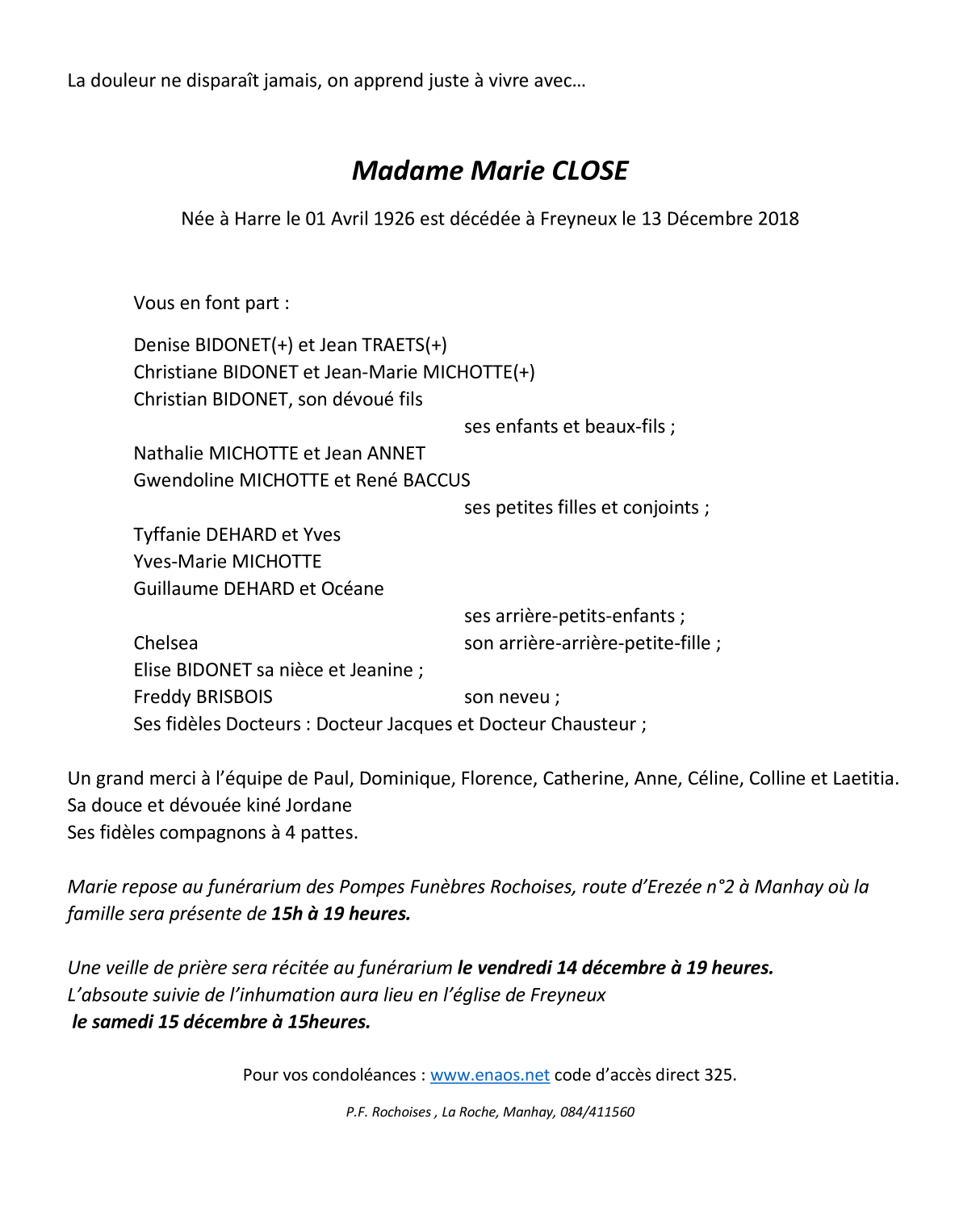 Décédée à Manhay (6960) le jeudi 13 décembre 2018 à l'âge de 92 ans