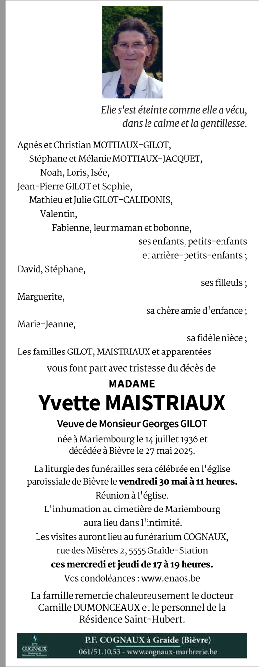 Décédée à Bievre (5555) le mardi 27 mai 2025 à l'âge de 88 ans