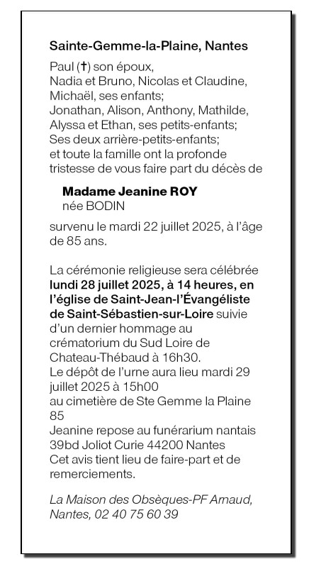 Décédée à Saint-Sébastien-sur-Loire (44230, France) le mardi 22 juillet 2025 à l'âge de 85 ans