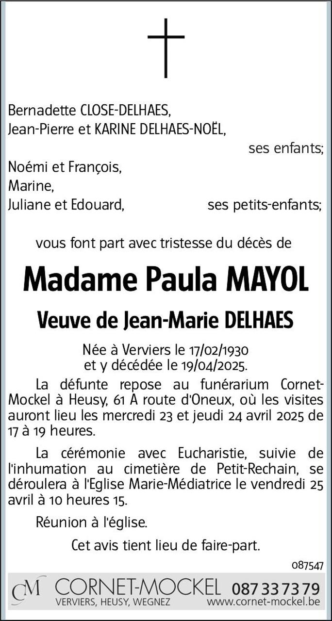 Décédée à Petit-Rechain (4800) le samedi 19 avril 2025 à l'âge de 95 ans