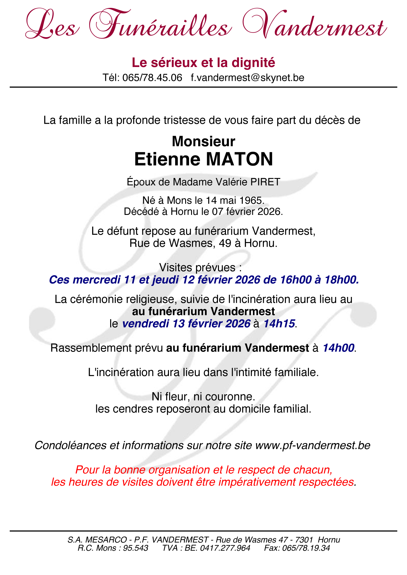 Décédé à Hornu (7301) le samedi 7 février 2026 à l'âge de 60 ans
