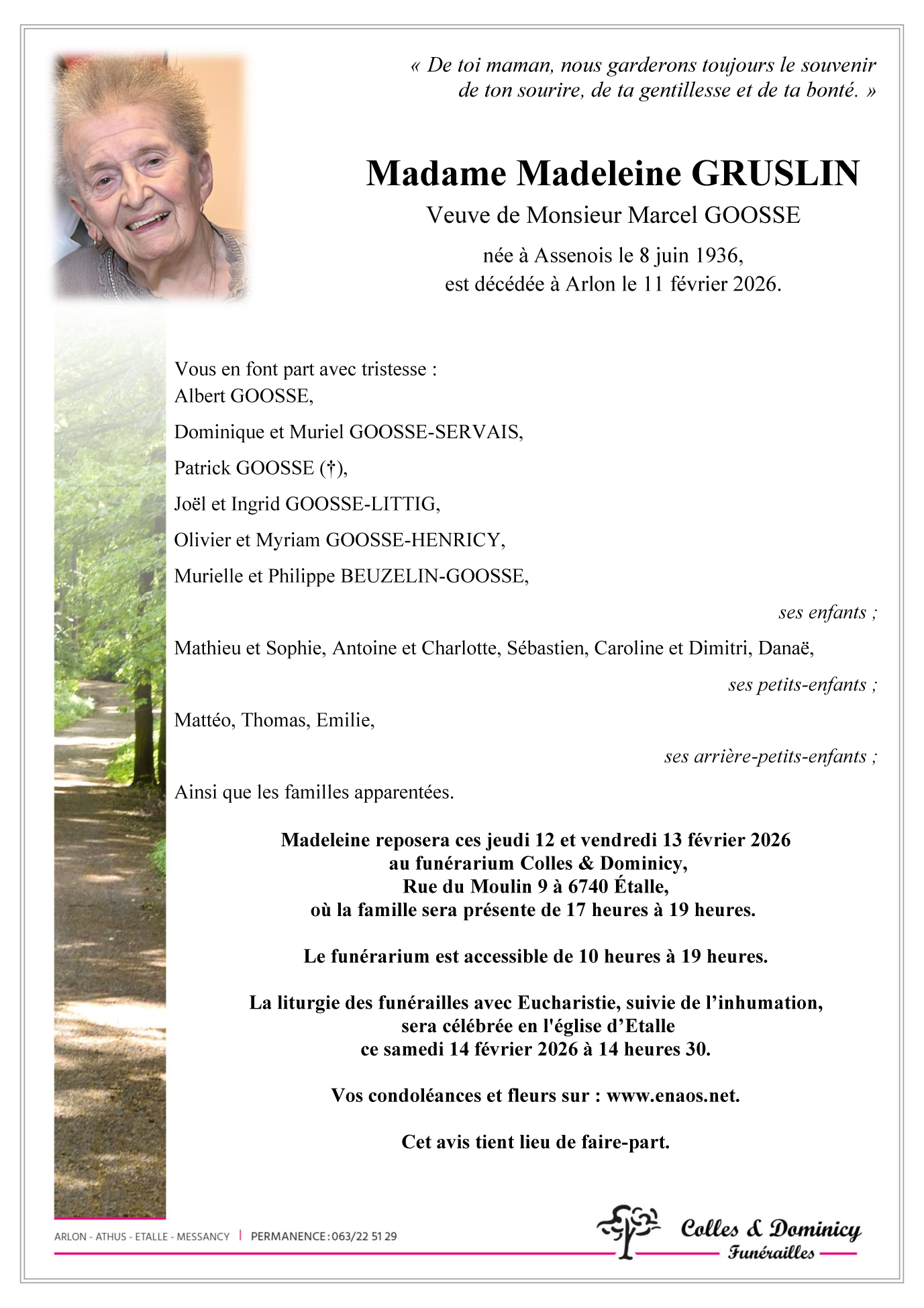 Décédée à Arlon (6700) le mercredi 11 février 2026 à l'âge de 89 ans