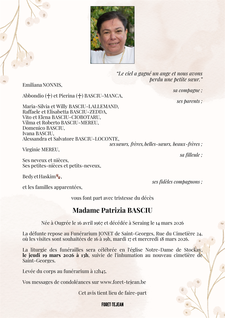 Décédée à Seraing (4100) le samedi 14 mars 2026 à l'âge de 58 ans