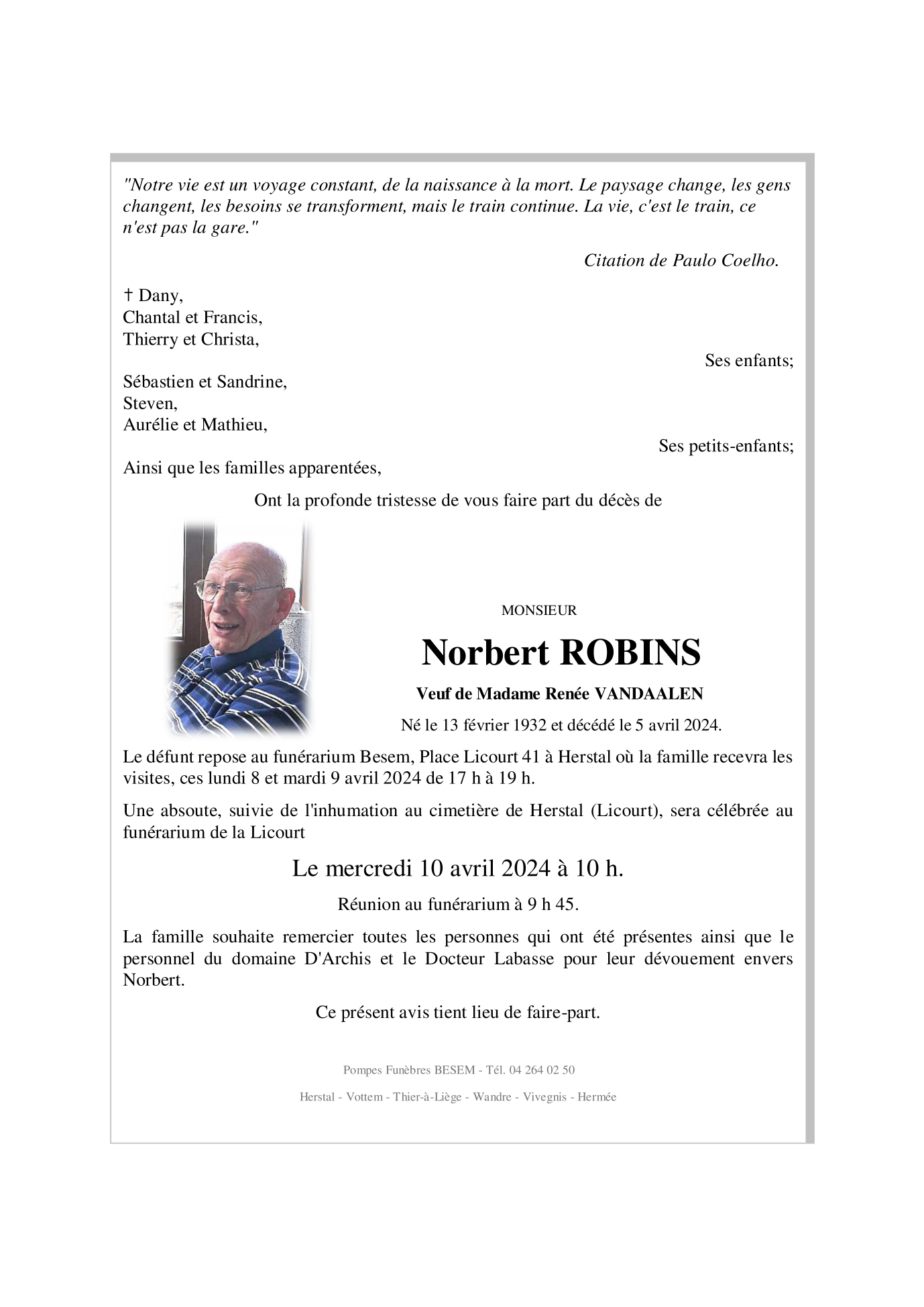 Died in Herstal (4040) on 05 April 2024 at the age of 92 years