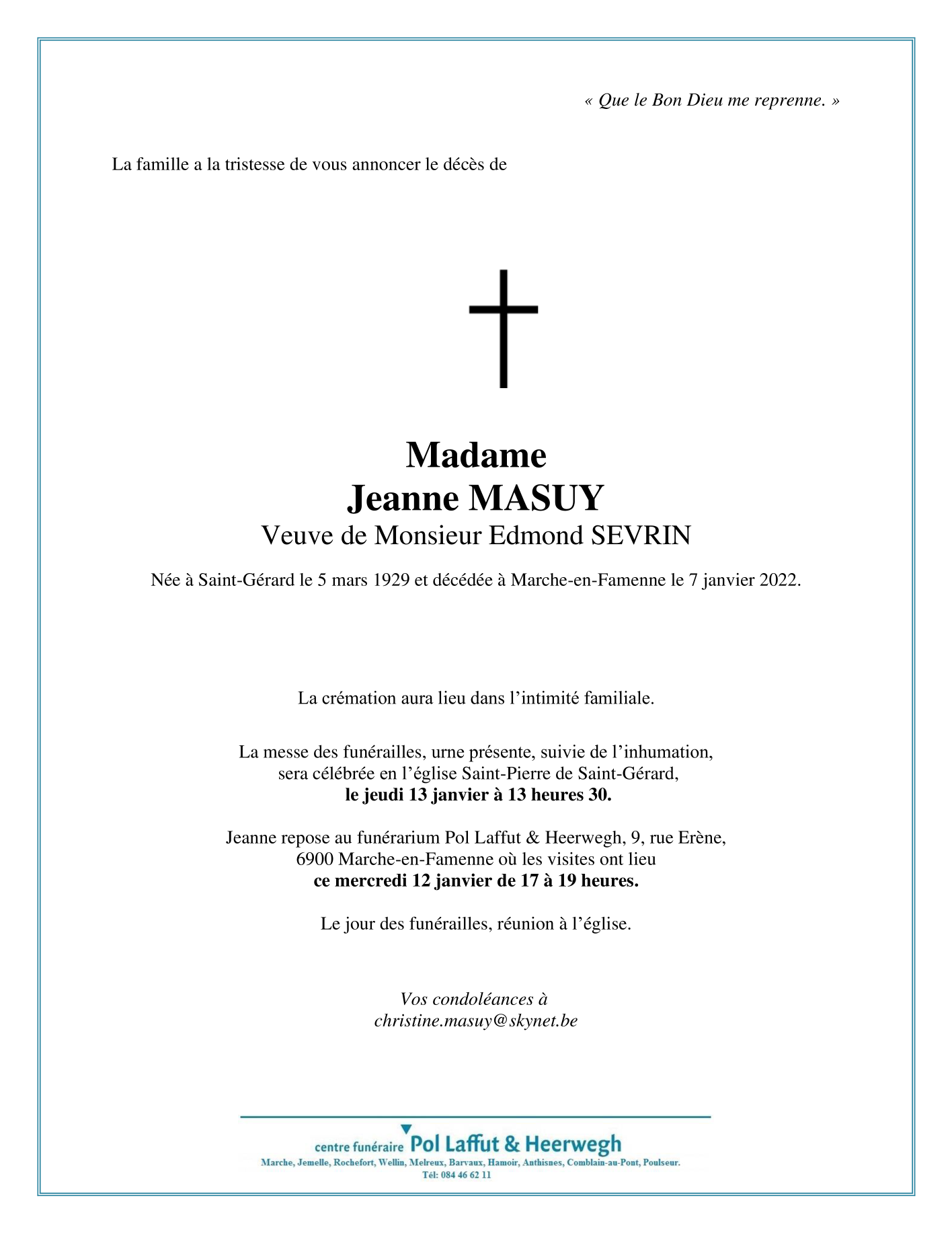 Décédée à Marche-en-Famenne (6900) le vendredi 7 janvier 2022 à l'âge de 92 ans
