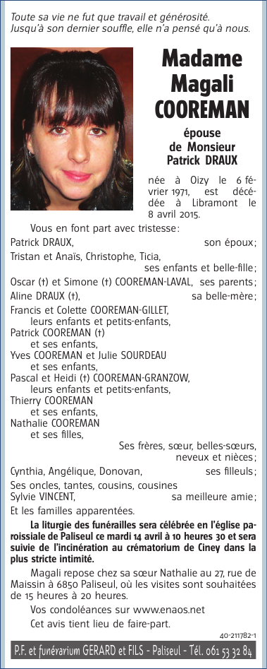 Overleden te Libramont (6800) op vrijdag 10 april 2015 op 44-jarige leeftijd