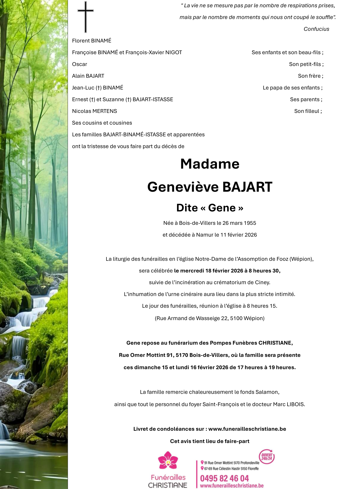 Décédée à Namur (5000) le mercredi 11 février 2026 à l'âge de 70 ans
