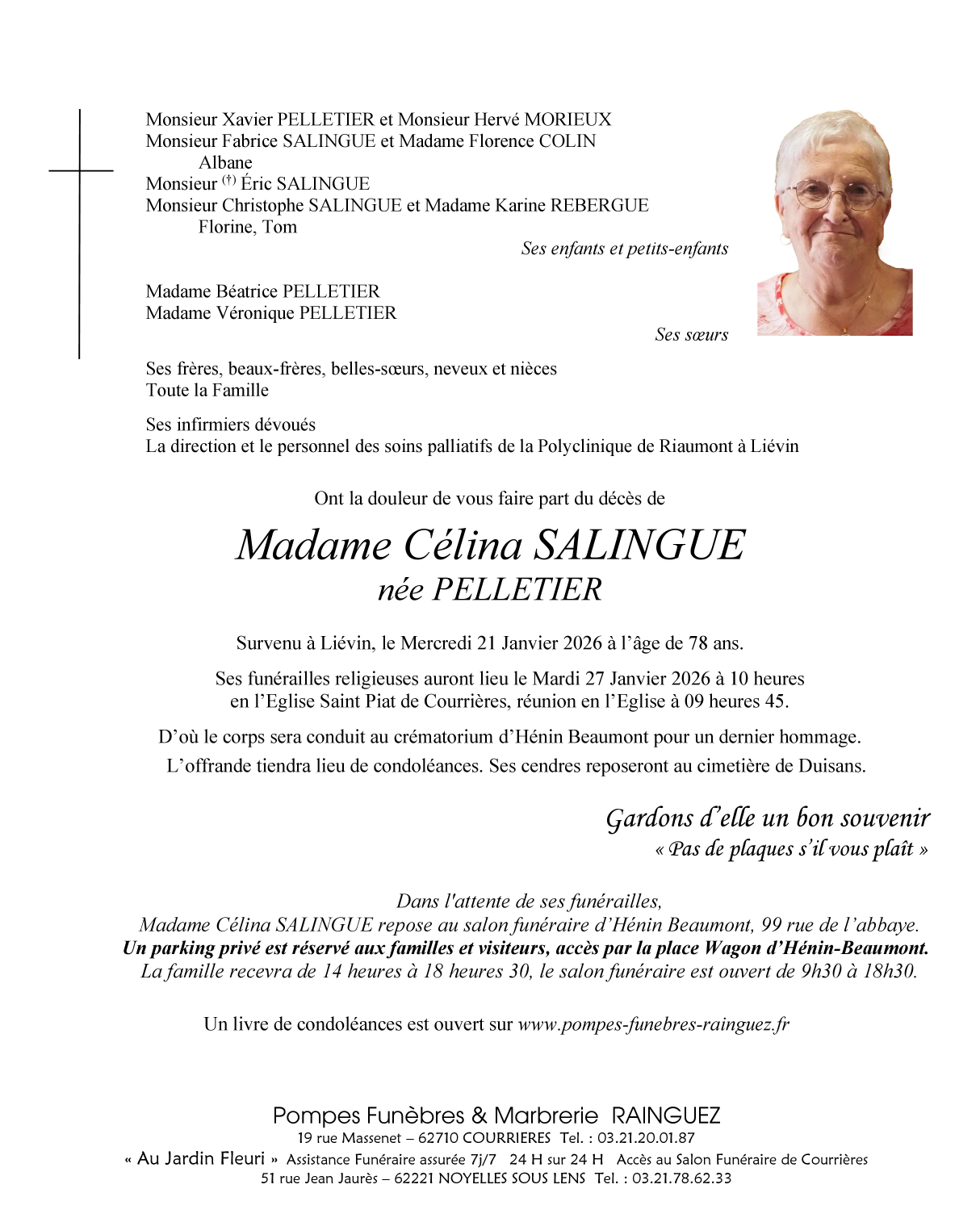 Décédée à Lievin (62800, France) le mercredi 21 janvier 2026 à l'âge de 78 ans
