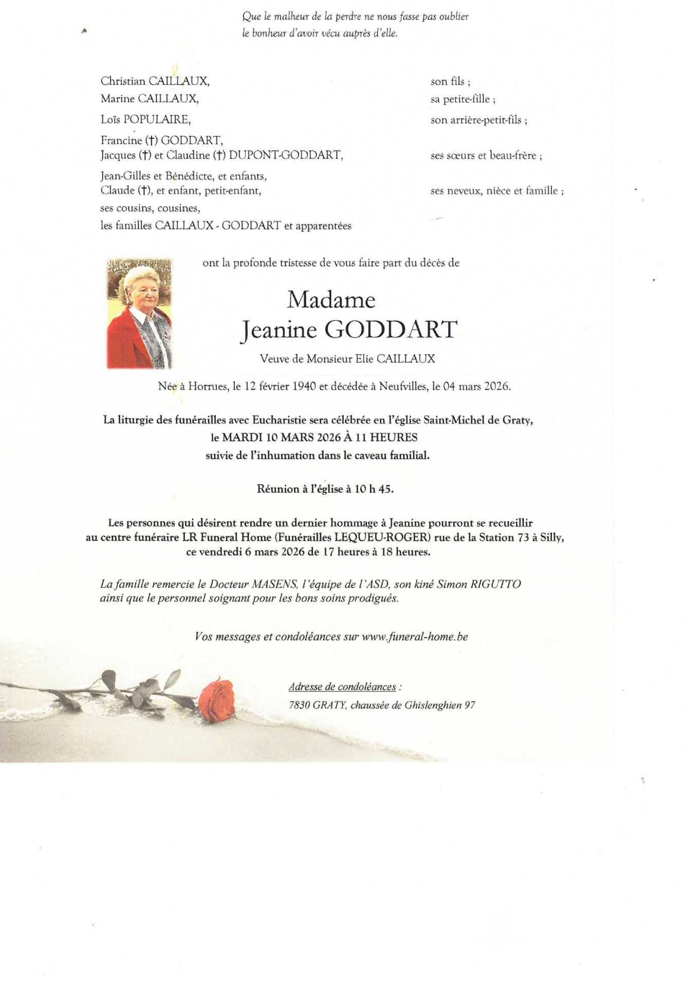 Décédée à Neufvilles (7063) le mercredi 4 mars 2026 à l'âge de 86 ans